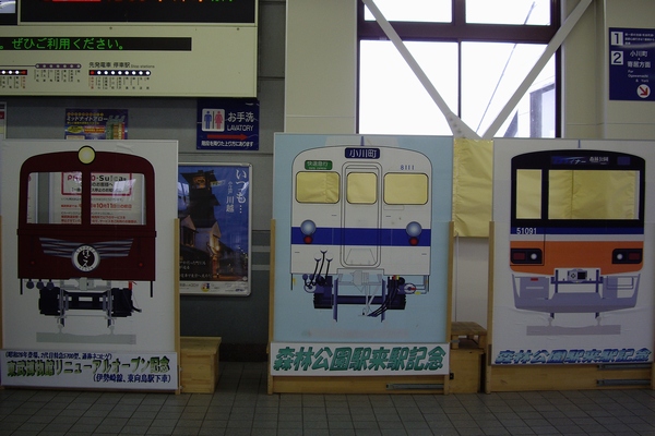 森林公園駅にある記念撮影用顔出し看板。ここにも8111が使われています。ちなみに、左側は東武博物館に復元保存されたモハ5701、右側はTJライナーに使われている最新鋭のクハ51091です。