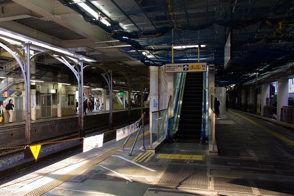1階の上りホームは改修の真っ最中。旧下り線は架線が外されロープが張られています。JRが3番以降を使っているため、京成上りホームは0番ホームとなりました。