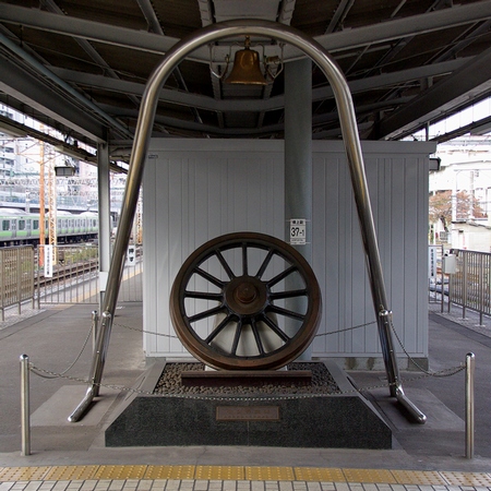 品川駅5・6番線東京方にある安全祈念碑です(2002年)。上の鐘は電気式ディーゼル機関車DD12に設置されていたもの、下の車輪は電気機関車の動輪に使われていたものです。説明がないので型番は不明なのでしょう。
