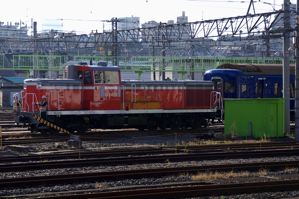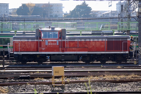 清掃が終わった寝台車を移動させるDE11 1029です。