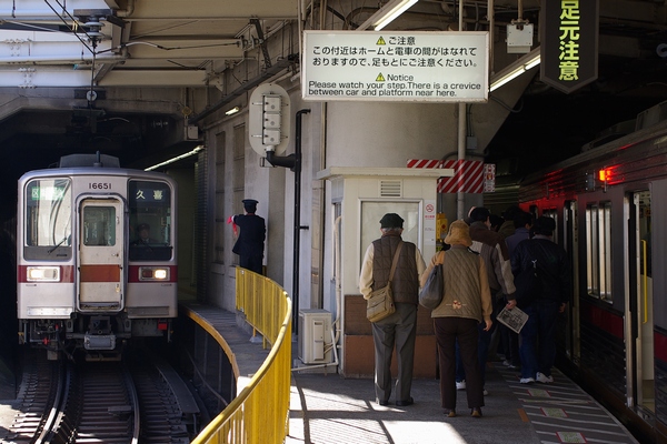東武のターミナル駅・浅草駅です。降車のお客さんがホームを歩いていますが、柱が大きくて窮屈そうです。