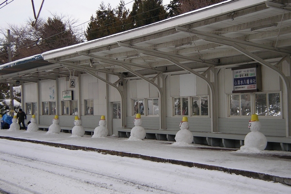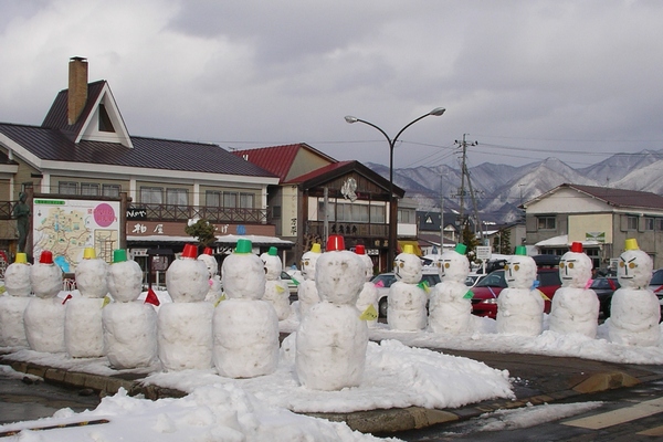 猪苗代駅前です。2月中旬の「雪だるま祭り」には雪だるまが多数作られます。