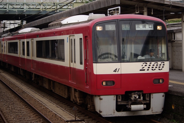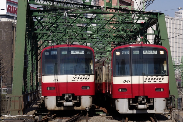八ツ山鉄橋ですれ違うデハ2133とデハ1041。正面はそっくりで、番号がなければ見分けがつきません。