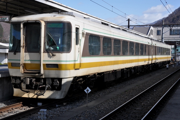 キハ8502。客室窓の丸みからもわかるように、キハ8500形はもともと名鉄の車両。特急「北アルプス」として働いていました。