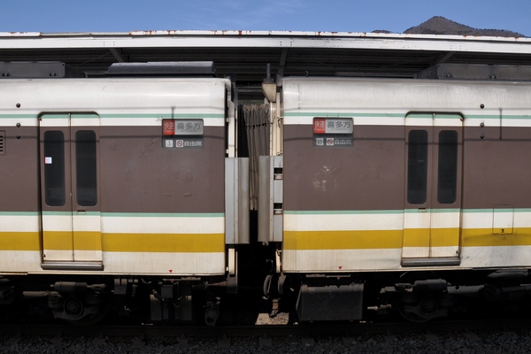 ドアは後方に1つなので、編成中央にドアが2つ並びます。行先は喜多方。東武鬼怒川線、野岩鉄道会津鬼怒川線、会津鉄道会津線、JR只見線、JR磐越西線の4社5線111.6kmを走破します。
