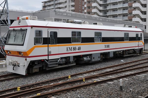 東武鉄道のPlasser & Theurer製軌道検測車EM80-40。スペーシア色。連結器も白塗装です。