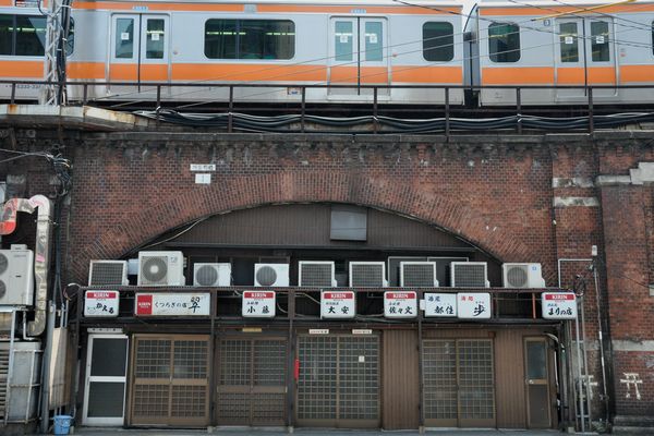 神田駅の南、新石町橋高架橋の南端。ドアの数だけ店がある。そのうち4店は隣と同時に出入りはできない。