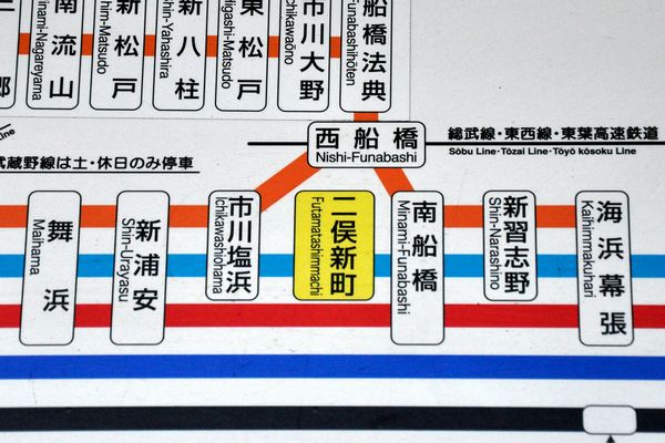JR京葉線二俣新町は「△西船橋-市川塩浜-南船橋」のデルタ線の、ちょうど底辺部分(市川塩浜-南船橋間)にあります。ほかの2辺にあたる西船橋-市川塩浜間と西船橋-南船橋間は、営業上の運転系統は武蔵野線です(分類上は両線とも京葉線)。