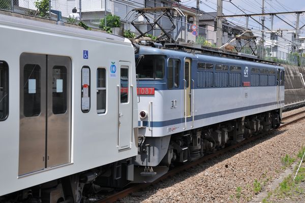 西武多摩川線用のワンマン&白塗装となった西武新101系249F(クハ1249)です。西武池袋線から短絡線を通って新秋津へ入った後、武蔵野線を北上しているところです。牽引機はEF65 1087。
