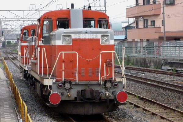 久喜駅を通過するDE10 1752。DE10は左右両側に横向きの運転席があります。入れ替えの時は便利でしょうが、本線を運転しているときはずっと横を向いていなくてはいけません。この角度から撮影すると、左運転席使用の側灯がよく見えます。