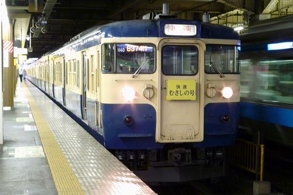 豊田車両センター115系M40編成快速「むさしの」クモハ115-318です。ヘッドマークを付けた朝夕2往復のみの通勤電車です(列車番号は8000番台の臨時列車)。