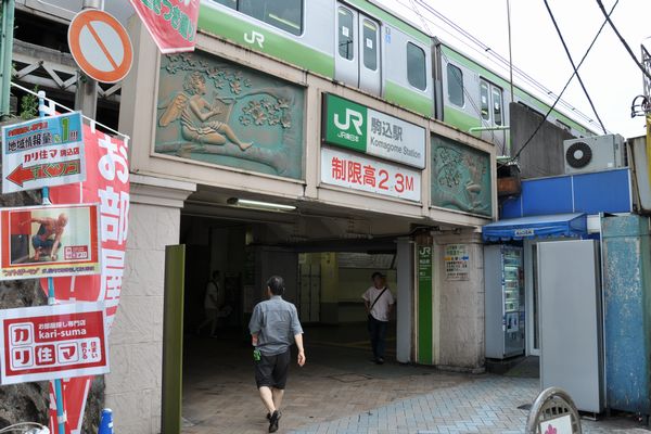 山手線駒込駅東口。駒込駅の入口に見えますが、実は一般道(車両は通行禁止)の架道橋「山手電車(45)中里道ガード」で、白Tシャツの男性が出て来たところが実際の入口です。