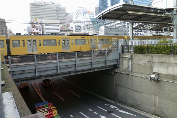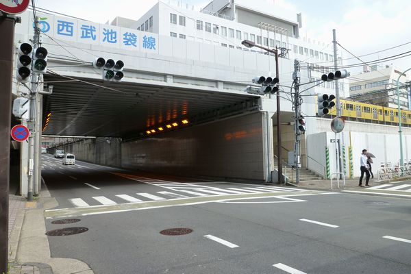 池袋駅南側の東西を車で抜ける唯一の道。通称「びっくりガード」。車道は坂道で、歩道は平坦な道を進み、