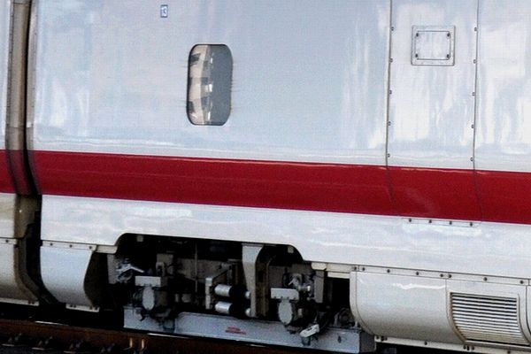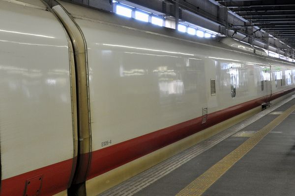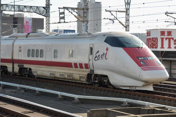JR東日本の新幹線用試験車E296形East-iです。East-iには在来線電化区間用のE491系や、非電化区間用のキヤE193系があります。画像は1号車のE926-1。ヘッドライト下は検測用のようで、非対称です。