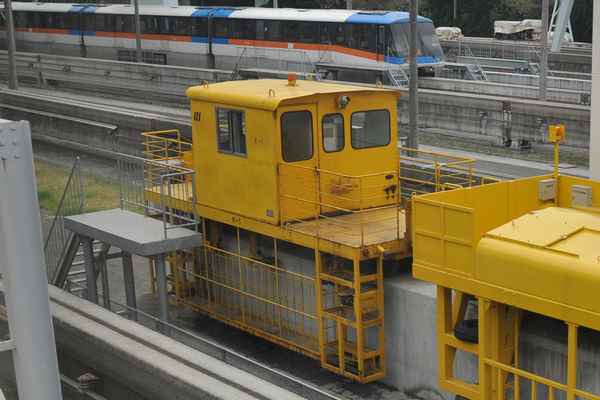 東京モノレール羽田線の昭和島にある車両区で見かけた保線車両 K-1。軌道部分に足場があるので軌道を検査するための車両でしょうか。