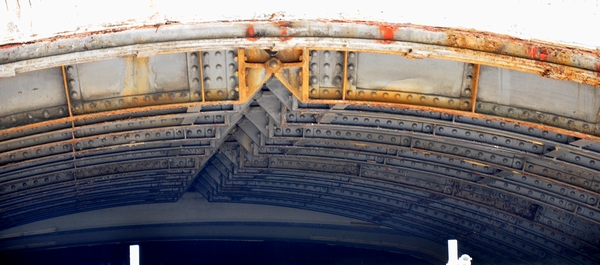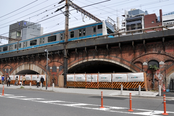 有楽町-新橋間の東海道線内幸町橋高架橋です。紅梅河岸高架橋と比較するとアーチが緩やかです。レンガ造りの高架橋が連続する区間ですが、橋によって意匠が少しずつ異なります。
