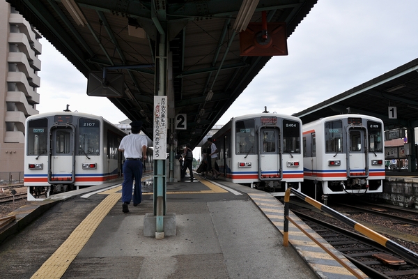 向かって右からキハ2109、キハ2404、キハ2107。キハ2400形は両運転台。