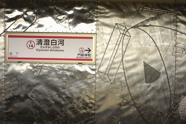 大江戸線の清澄白河駅。金属板のデザインの壁面。