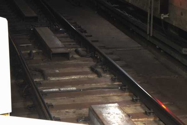 この駅は2面3線で中線があります。リアクションプレートが一部切れています。