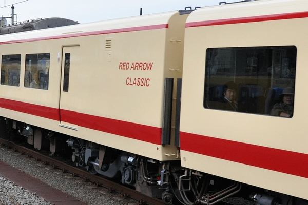西武10000系によるレッドアロークラシック車です。初代の5000系レッドアローに塗色だけ似せていますが、ヘッドライト位置が異なるのであまり似ていません。