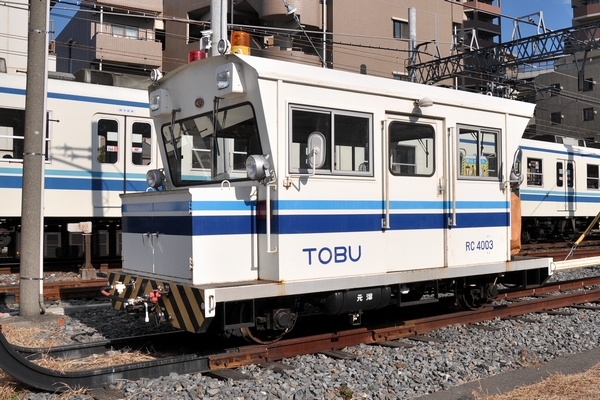 東武のレール輸送用制御車RC4003です。松山重工業製です。背後を走っている8000系と同じ配色です。