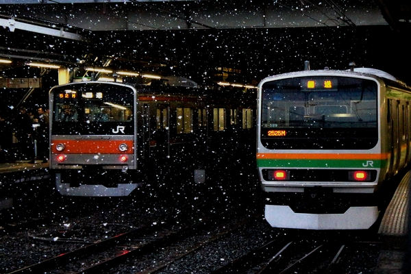 都区内の自宅を暗いうちに出て埼玉の大学へ向かう途中、大宮で少し駅撮りしていると、大きなぼたん雪が降ってきた。寒かった。