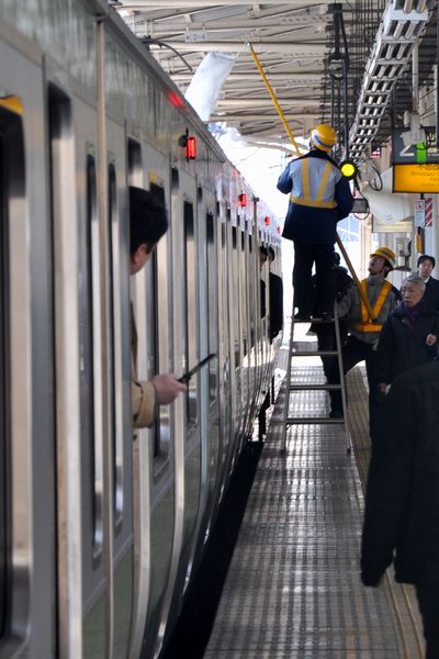上野駅の山手線内回りホーム。絡まった袋を取り除いている様子です。