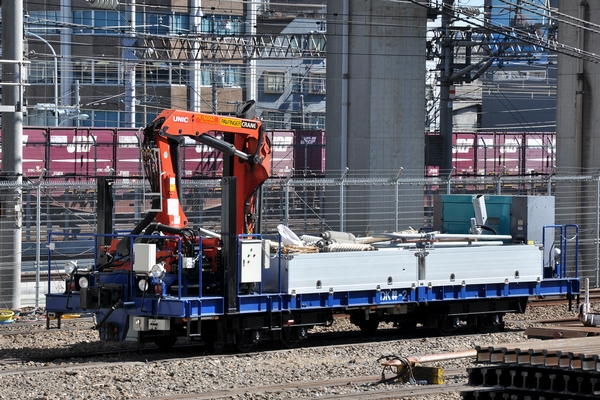 新幹線用のクレーン付き無蓋車NDK幹-2です。碍子などが積まれていました。