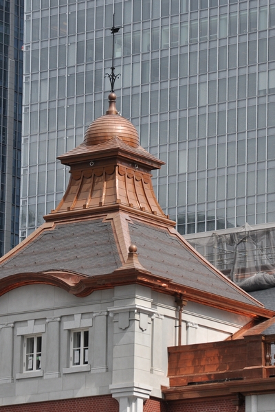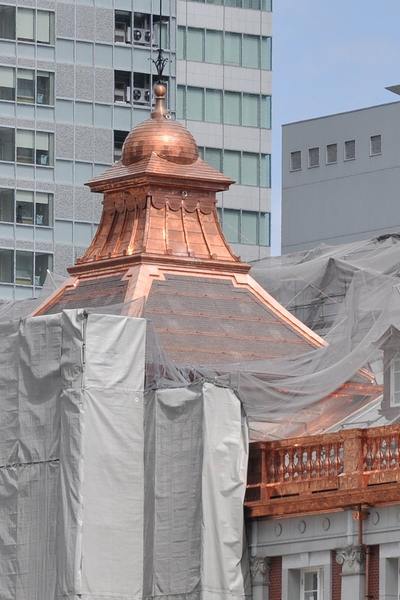 2週間もすれば光沢はなくなり、しだいに落ち着いた色になってきます。光り輝く東京駅は工事中しか見られませんので、見学はお早めに。