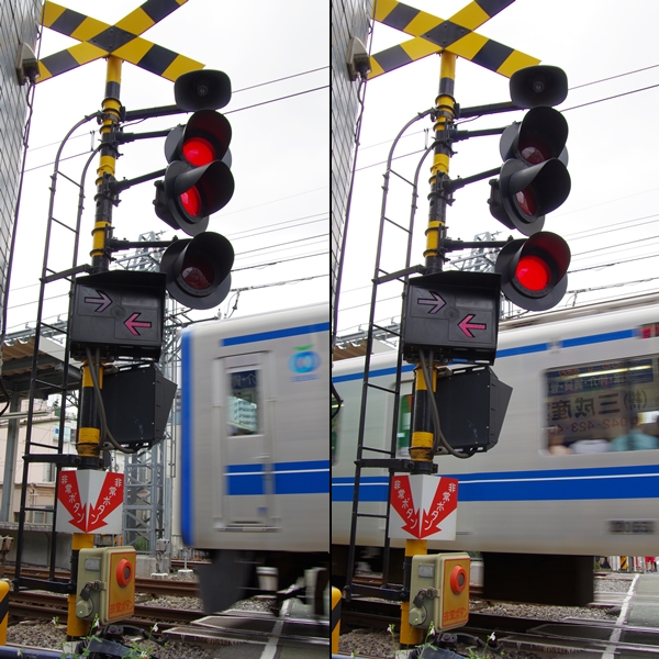 西武池袋線・ひばりヶ丘駅の飯能方にある「ひ1踏切」の警報灯は3灯で、上2灯と下1灯が交互に点滅。金属工業西踏切の8灯に匹敵する珍しさですが、いずれは全方向型になるのでしょう。