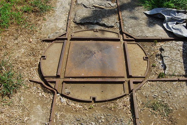 堆肥舎とトロッコ車庫(テント)との分岐位置にあります。東大農場飼畜場軌道の分岐はすべて転車台で行っていました。テントの先にも軌道が延びて畜産設備がありましたが、現在は塞がれています。