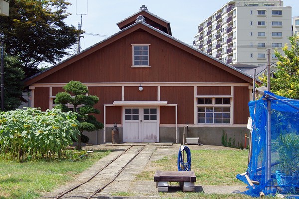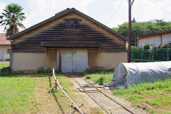反対側の旧乳牛室(現農場博物館)。現役だった頃は乳牛室内までレールが伸びていました。