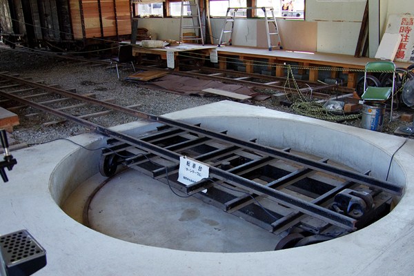 旧頸城鉄道百間町車庫内にある転車台です。公開日には間近で見ることができます。