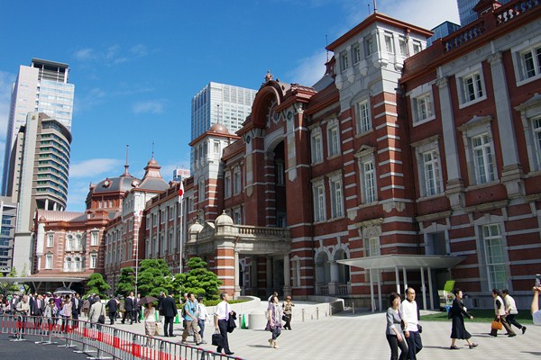 復原工事が完了した東京駅です。観光客がたくさんいます。