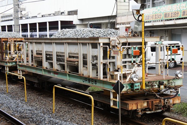 JR東日本・東京省力化軌道工事区のコマツ製バラスト運搬車です。エアコン完備の制御室が付いています。