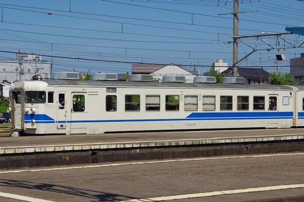 クハ455-701はサハ455-1を制御車化した車両。JR西日本のいわゆる魔改造ではなく、まともな顔がついている。しかし、戸袋とは関係ない窓が戸袋窓のような形になっている。