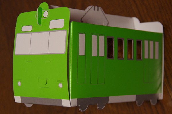 JR東日本フードビジネスの「東京あんぱん 豆一豆」が製造販売している「電車ぱん」です。山手線103系デザインの紙箱です。連結器とか、結構こっています。