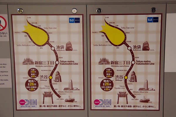 この駅は開業時から東急管轄なので、駅員も売店も駅名表示も東急ですが、駅の自動放送やホームドアの広告は東京メトロになっています。