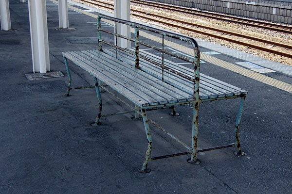 土浦駅2・3番線ホーム北端にある鉄製ベンチ(座面は木材)。相当古いようで、作られてから40年以上は経過していると思われ、足はホームにめり込んでいます。ベンチとしてはかなり高さが高いです。