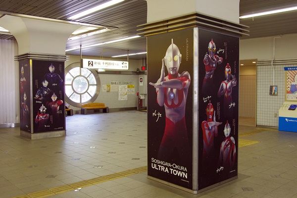 小田急・祖師ヶ谷大蔵駅。近くに円谷プロダクションの旧本社があったので、ウルトラマンが描かれています。発車メロディもウルトラマンです。