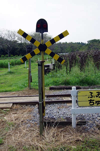 羅須地人鉄道協会まきば線のトロッコ列車駅に隣接する踏切です。軌間は610mmで踏み板は木製。標識と警報灯があり、遮断機はありません。