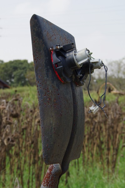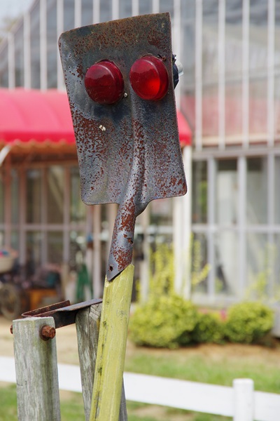 警報灯。角形ショベルに穴を2つあけて、赤ランプをネジ止めしています。今年の彷鉄大賞(そんなものありませんが)はこれで決まりです。ダントツです。