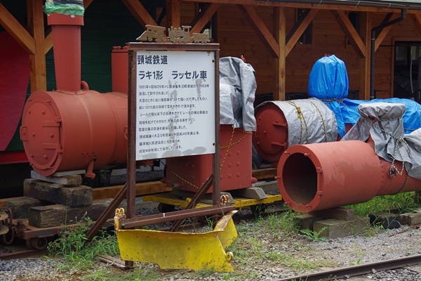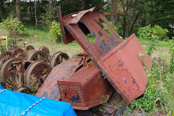 羅須地人鉄道協会は610mmゲージの蒸気機関車を製造して走らせていますが、これは将来の新車でしょうか。煙突部分から出た雑草が素敵。
