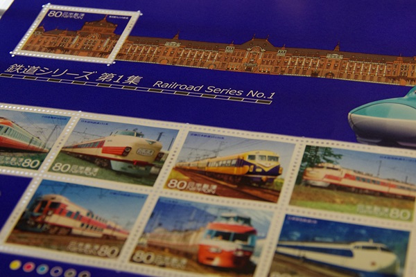 日本郵便の特殊切手「鉄道シリーズ 第1集」です。鉄道の日制定20周年に合わせて発行されました。東京駅、小田急3000形、国鉄151系、近鉄10100系、国鉄キハ81、名鉄7000系、近鉄20100系、小田急3100形、新幹線0系、JR東E5系の10種類です。