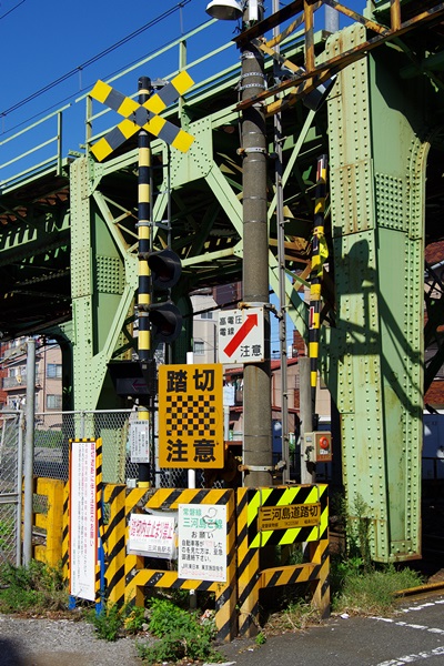 三河島道踏切です。「こ線橋」と「踏切」の表示が並ぶ珍しい風景です。