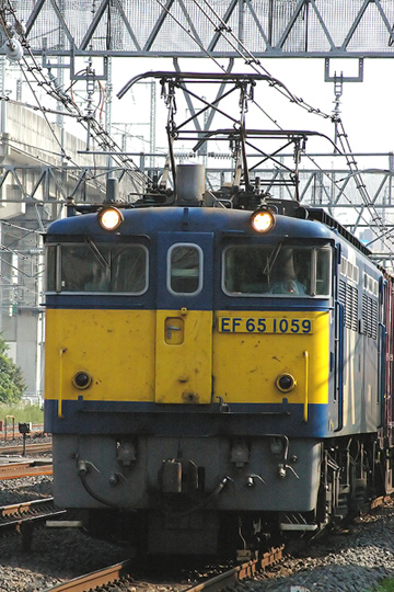 貨物試験塗色のEF65 1059です。許し難い色ですが、大所帯のEF65ファミリーでも一両だけなので「希少性」ということで許してやりましょう。