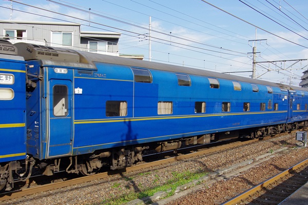 「北斗星」のオハネ25 562です。傷んだところだけを修復したのか、青色が2色になってしまいました。