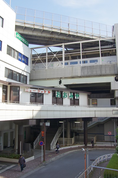 大宮駅の北側。1階部分の先には大宮車両センター、2階にはニューシャトルの大宮駅、3階は新幹線、4階は駐車場に入る道。よくこれだけ詰め込んだものです。