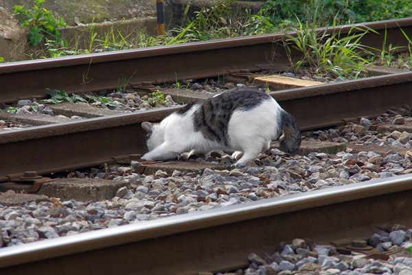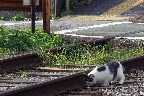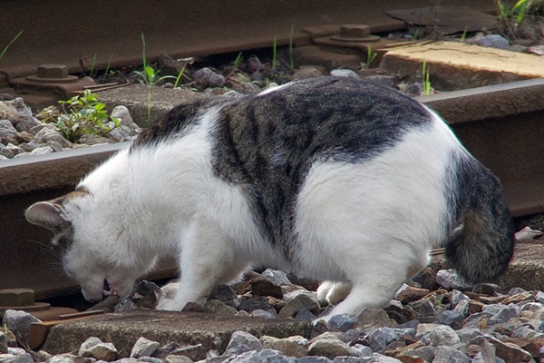 都電荒川線・東池袋四丁目停留所付近のネコ。レールの下に何かを見つけました。