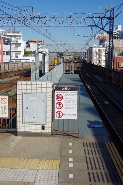 東急東横線新丸子駅に設置されている降車専用通路です。新丸子駅は8両編成しか停車できない構造ですが、運行障害や緊急時に10両編成を停車させ乗客を降車させる安全設備です。上下ホーム両端に設置されています。柵は固定されていて平常時は立入禁止です。